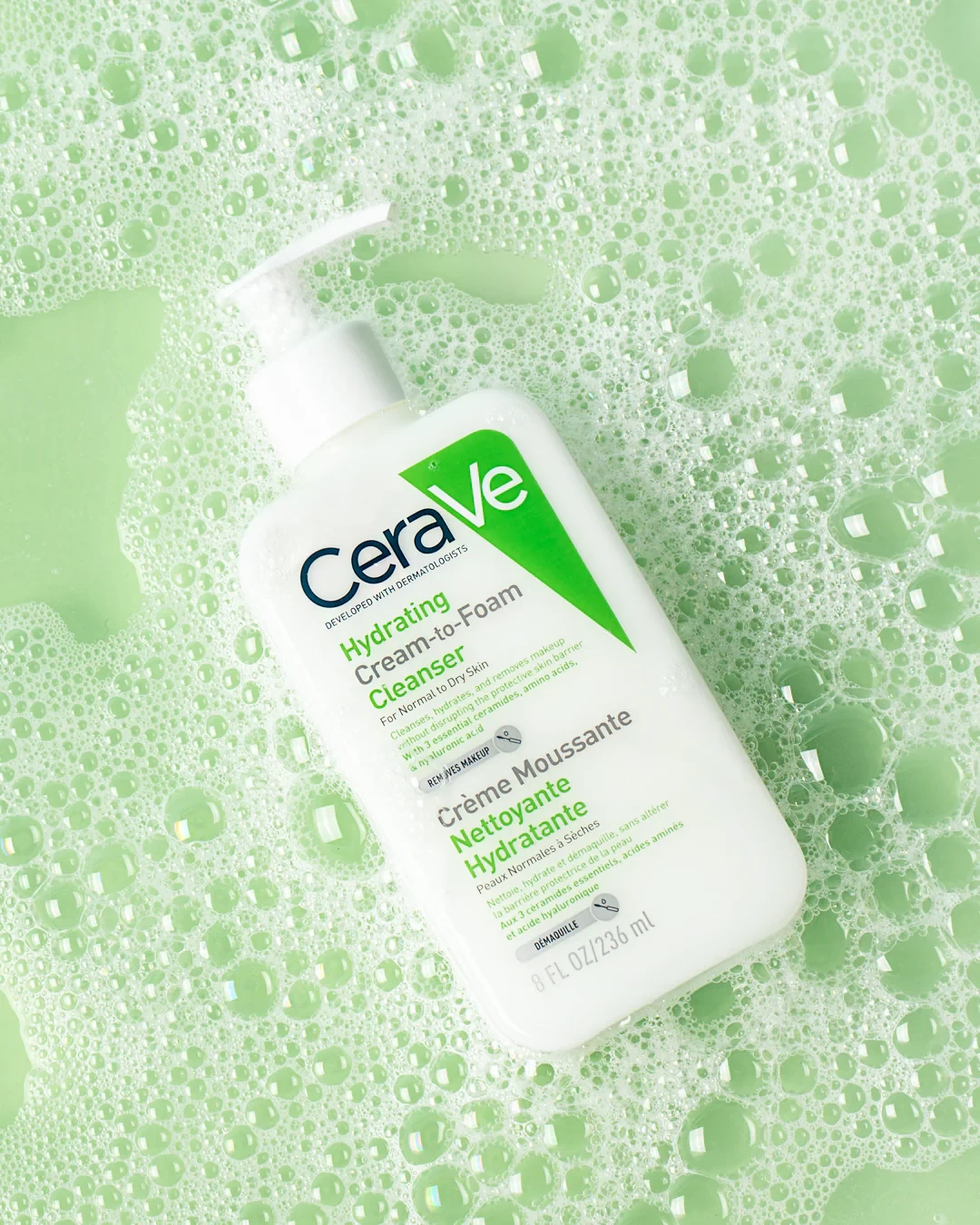 Strips away dirt and make up without stripping the skin barrier. With 3 essential ceramides, amino acids & hyaluronic acid. For Normal to Dry Skin. CeraVe Hydrating Cream to Foam Cleanser is the one step foaming cream cleanser your dry skin craves! Thanks to its unique combination of gentle ingredients and Amino Acid blend it gently yet efficiently cleanses and removes make up, oil and impurities off your face and eyes. All while hydrating and maintaining the skin barrier. Your skin feels instantly fresh, soft and hydrated. Perfect for those who like foaming cleansers but finds their skin is tight after using them.