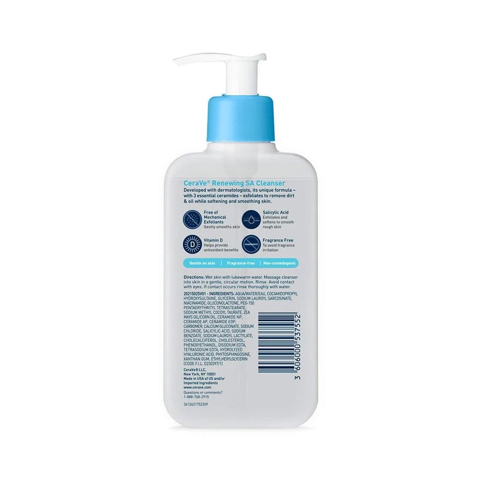 CeraVe Renewing SA Cleanser provides gentle, non-irritating exfoliation without harsh microbeads that can scratch your skin. Suitable for use on your face and body as well as acne-prone skin, our salicylic acid cleanser not only exfoliates the skin, but with three essential ceramides, hyaluronic acid and niacinamide, it also helps soften and smooth the skin without disrupting its protective barrier. This formula is also non-comedogenic, fragrance-free and enriched with antioxidant vitamin D.