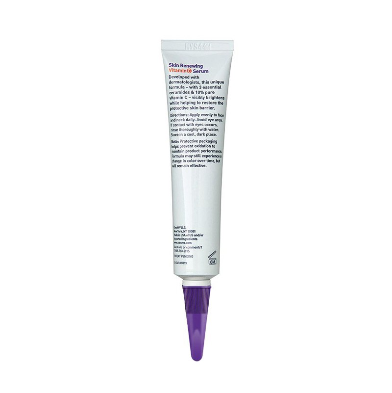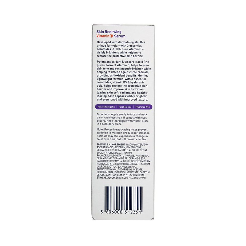 CeraVe Skin Renewing Vitamin C Serum features 10% pure vitamin C (L-ascorbic acid) for antioxidant benefits, while also helping to visibly brighten your complexion and promote a more even skin tone. Potent, yet gentle and lightweight, our vitamin C serum is also formulated with three essential ceramides , moisturizing hyaluronic acid and soothing vitamin B5 to help improve texture, restore the skin’s protective barrier and enhance hydration for soft, radiant, healthy-looking skin. Suitable for all skin types, including sensitive, our vitamin C serum also comes in protective packaging that helps prevent oxidation and maintain product performance.