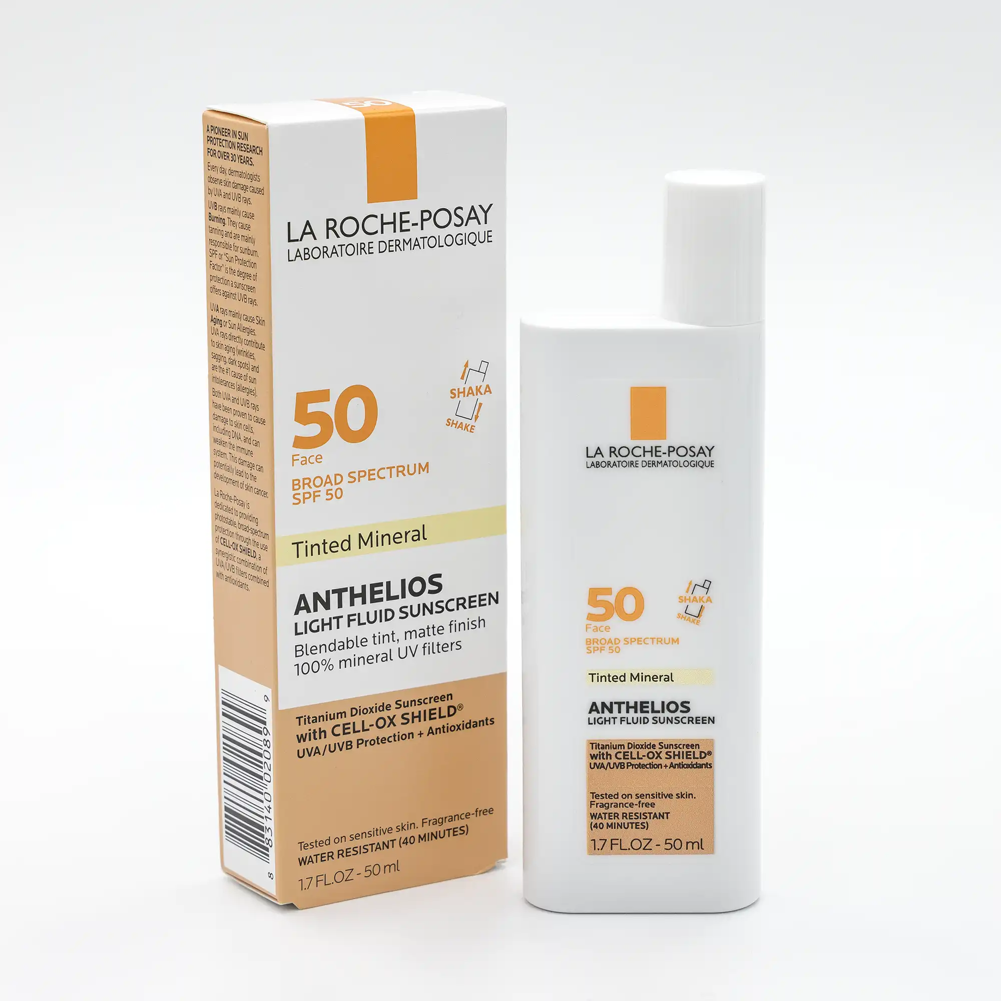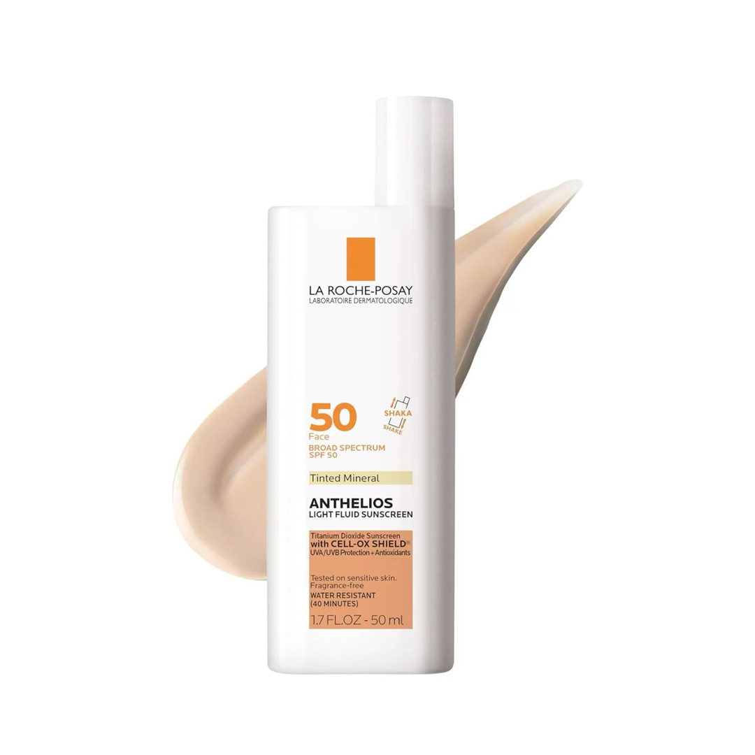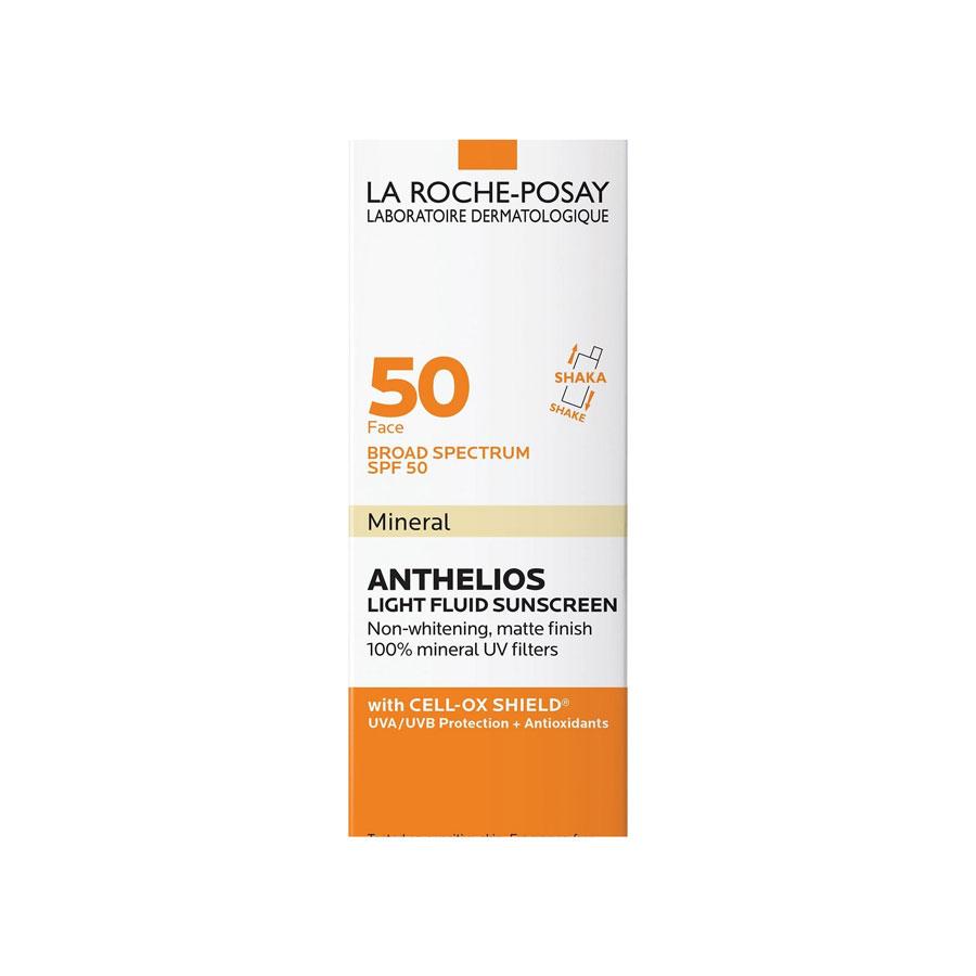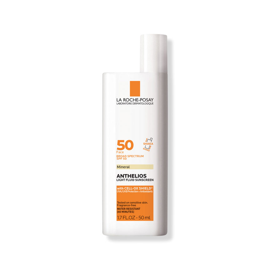 La Roche-Posay Anthelios Mineral Ultra-Light Sunscreen Fluid SPF 50 with zinc oxide and titanium dioxide offers oil-free, 100% mineral sunscreen protection.