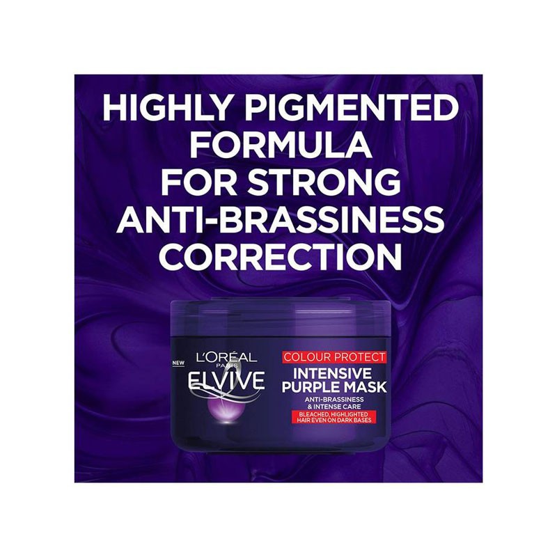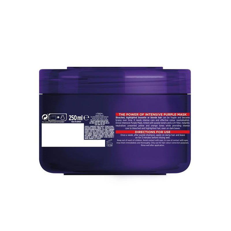Bleached, highlighted brunette or blonde hair can be fragile and become brassy over time. It needs intense care and effective colour neutralisation. Elvive Intensive Purple Mask, tinted with purple toners and a UV filter, instantly neutralises unwanted yellow and orange tones while providing intense care to bleached and highlighted hair, even on dark bases. Nourishes hair & neutralises brassy tones. Highly pigmented formula for strong anti brassiness correction. Ultra rich & luxurious texture conditions colour treated hair, helping to leave it looking smoother and softer.