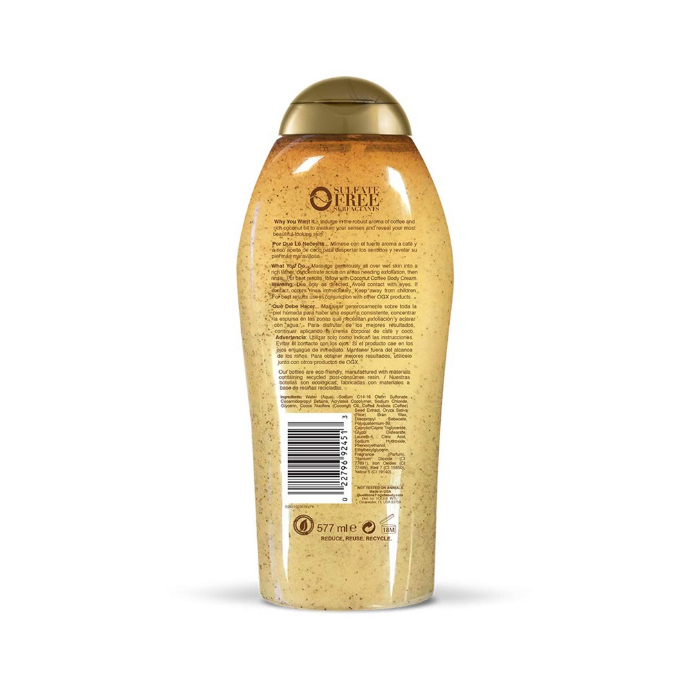 SMOOTH & SOFTEN: Indulge in the robust aroma of coffee & rich coconut oil with the OGX Smoothing and Coconut Coffee body collection. Try the Body Scrub & Body Cream for skin that feels silky-smooth.