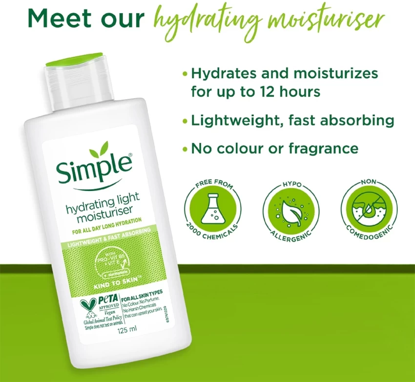 Simple Kind to Skin Hydrating Light Moisturiser provides care with a light feel on skin, leaves skin feeling soft, smooth and perfectly hydrated for up to 12 hours.