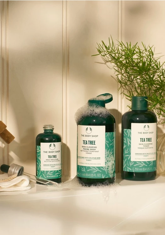If you’re prone to excess oil and blemishes, it’s time to come face to face with a regimented skincare routine. First step, meet your new tea tree cleanser. Our face wash has been formulated with blemished skin in mind, to help give you that refreshed feeling. It’s hard-working, vegan and enriched with Community Fair Trade tea tree oil from Kenya. And to top it off, The Body Shop’s tea tree face wash has been a lengthy trusted favorite for its ability to help oust grime to reveal more mattified, clearer-looking skin.